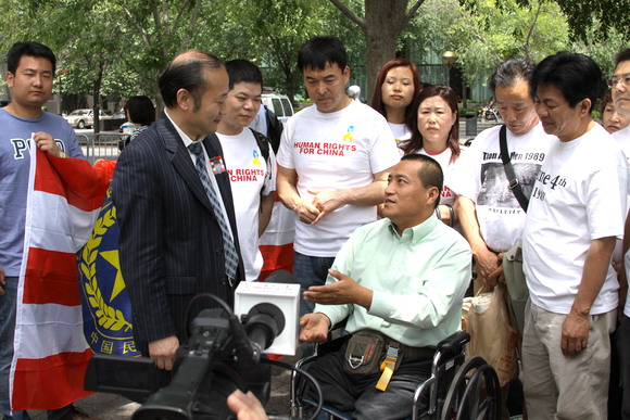 图20:2011年6月4日中午,众多民运组织与民运团体在纽约联合国前举行纪念“89六四”二十二周年大型集会,图为《中国民主报》记者采访在89六四事件中被中共军队的坦克碾去双腿的英雄方政先生。