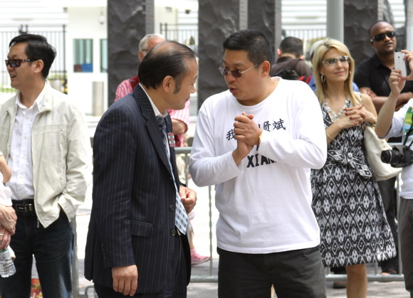 图24:王军、杨建利与《中国民主报》记者在集会现场。