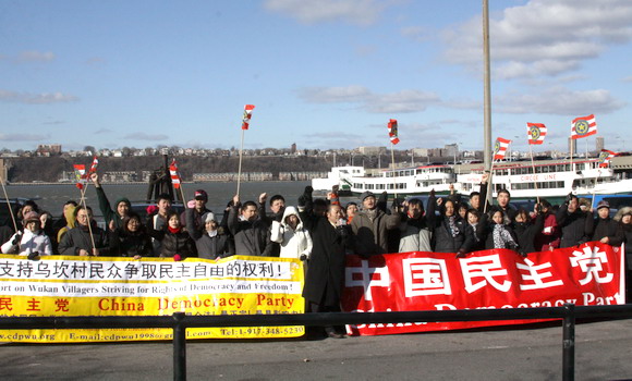 2012年1月3日上午11时,二百多名中国民主党成员顶住刺骨的寒风来到中国驻纽约总领事馆前举行集会,“坚决支持乌坎村民众争取民主自由的权利”,“强烈要求在中国实现民主、自由、人权和法治”。中国民主党主席、《中国民主报》社社长王军出席了今天的集会。