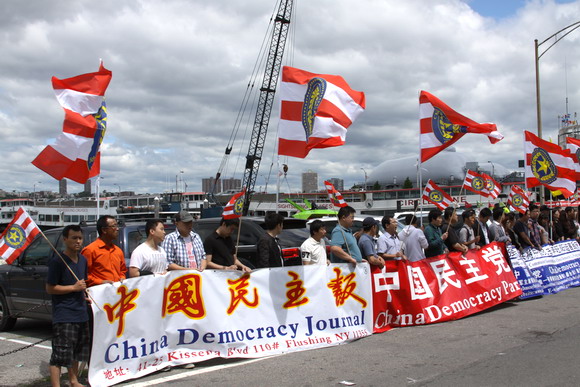 图8:2012年6月26日上午11时,近两百名中国民主党成员来到中国驻纽约总领事馆前举行集会,“要求中共政府立即释放所有被关押的中国民主党人!”。