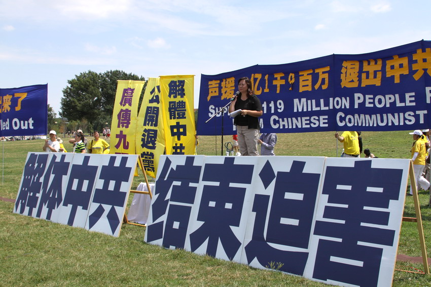 在近两个小时的集会上,有九位演讲者在集会上发言,他们表示,13年来法轮功学员以平和理性的态度反迫害,其行为激励人心、感召天地,带领着中国社会走向文明与进步。法轮功学员不屈不饶、坚忍不拔的精神鼓励了亿万中国人,他们协助和规劝中国民众退出中共党、团、队,在精神上进行远恶近善的道德选择,从而获得生命的救赎。一些在美国的民众在集会上现场退党(团、队),全球退党服务中心易蓉女士给这些三退民众颁发退党证书。